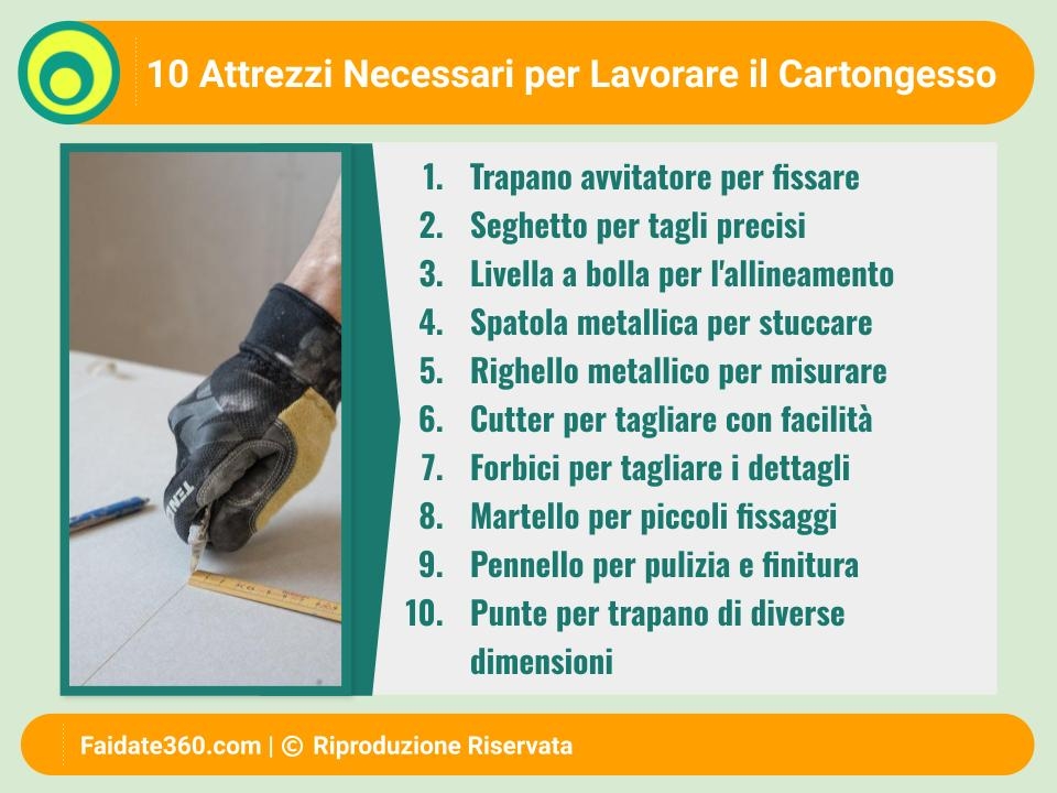 Ogni strumento ha una funzione specifica nel processo di lavorazione del cartongesso.