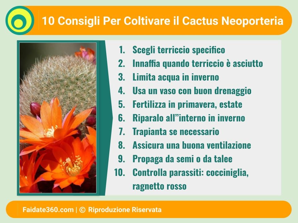 Posso coltivare la Neoporteria in un vaso? Sì, la Neoporteria si coltiva bene in vaso. Assicurati solo che il vaso abbia dei fori di drenaggio per evitare il ristagno d'acqua.