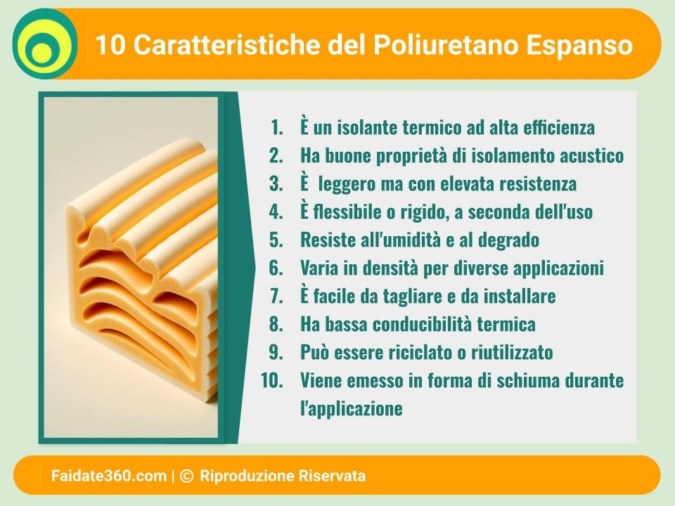 Caratteristiche generali. Il poliuretano espanso si distingue per una serie di proprietà che lo rendono unico. Una delle principali è la sua versatilità: viene prodotto con diverse densità e rigidità, permettendo un'ampia gamma di applicazioni. Ha un'ottima resistenza meccanica, anche a bassa densità, e mostra un'eccellente resistenza al calore e agli agenti chimici. Inoltre, ha notevoli proprietà di isolamento termico e acustico, rendendolo ideale per l'edilizia e altre industrie.