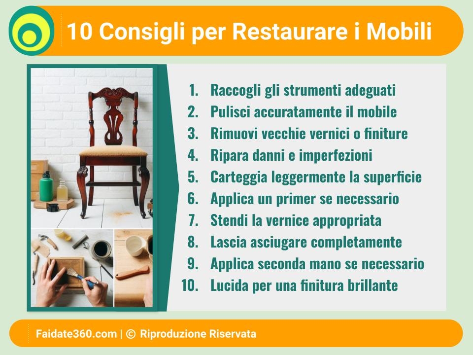 Vernice e tinta: Il colore del mobile è uno degli aspetti più distintivi. Scegliere la giusta tinta o vernice è cruciale per il successo del restauro. Ricorda che le vernici a base d'acqua sono più ecologiche, ma quelle a base di solvente danno un finish più duraturo.