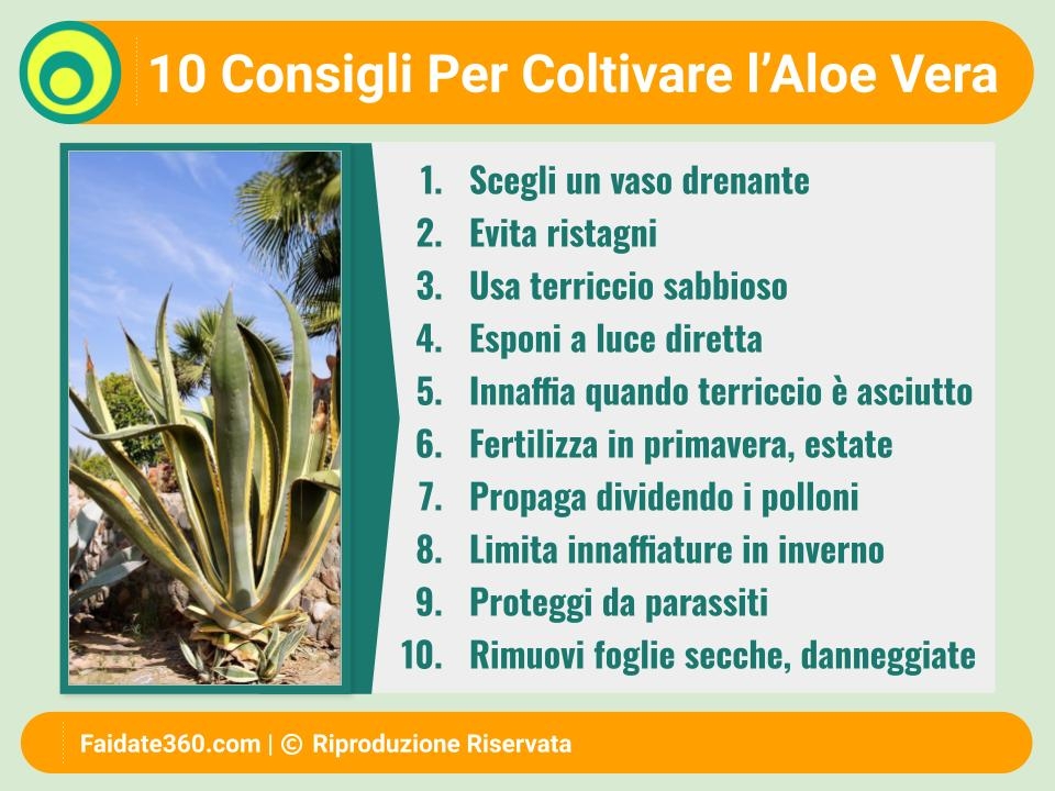 Evita il sole cocente: Sebbene l'Aloe Vera ami il sole, non sopporta il sole estivo cocente, specialmente nelle ore centrali della giornata. Potrebbe causare scottature sulle foglie.
