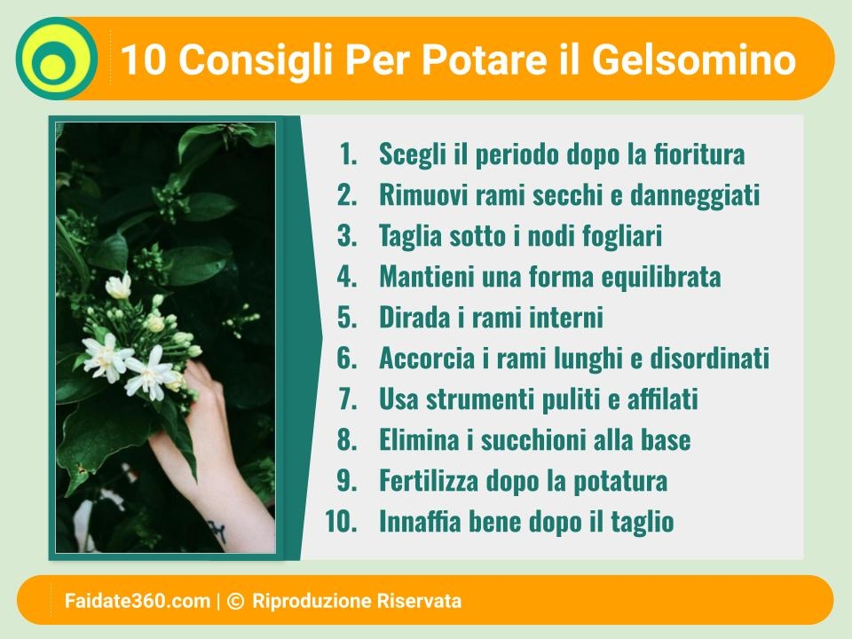 Nota: La potatura deve essere sempre svolta in base alla specifica varietà di gelsomino e al suo ciclo di crescita e fioritura. Una potatura sbagliata danneggia la pianta e compromette la sua fioritura. Se non sei sicuro, è sempre meglio consultare un esperto o un manuale di giardinaggio affidabile.