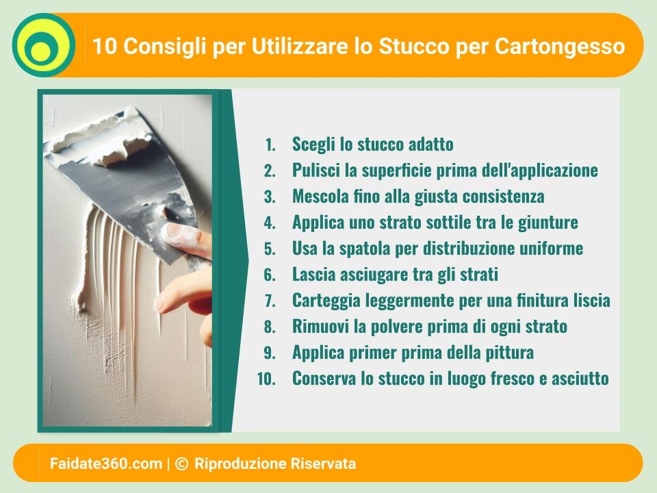 Presta Attenzione alla Consistenza dello Stucco: Se lo stucco è troppo denso o troppo liquido, potrebbe non aderire correttamente alla superficie del cartongesso. Segui attentamente le istruzioni del produttore per ottenere la consistenza giusta.